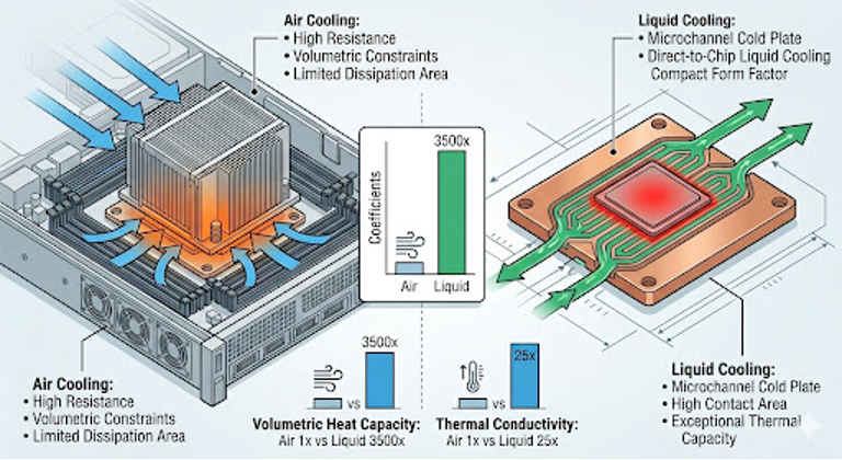Figure 1: Comparative heat transfer schematic showing bulky air heatsinks vs. compact direct-to-chip liquid cold plates, highlighting liquid’s massive efficiency advantages per volume.