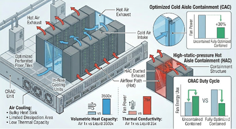 Higher loads complicate airflow, requiring hot/cold aisle containment, high static-pressure fans, and raised-floor tweaks. At scale, air guzzles energy via fans and CRAC units, plus noise and space issues. It shines in edge computing, moderate enterprise racks, and budget-focused setups.